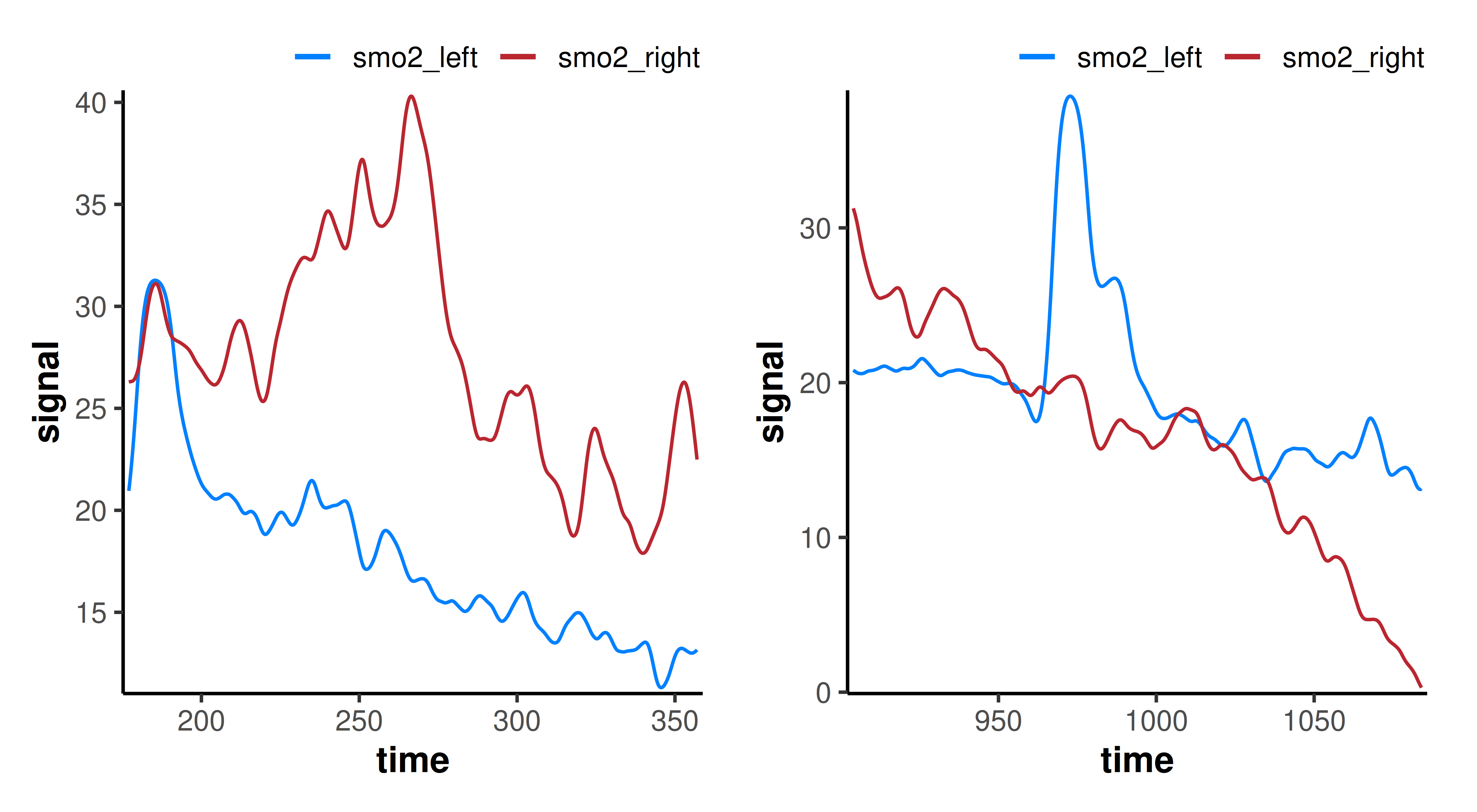 By normalising this way, we might lose meaningful differences captured by the different amplitudes between smo2_left and smo2_right, but we might be more interested in the trend or time course of each response.